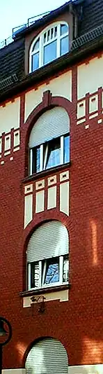 Erhaltene Beispiele für den Jugendstil sind Villa Schliz, das Doppelhaus an der Südstraße 129, 131, Haus Cäcilienstraße 58, Haus Kernerstraße 60, Haus Rosskampfstraße 4. Kennzeichen für den Jugendstil ist die „reliefartige Ornamentik geometrisierender Art“.[46]