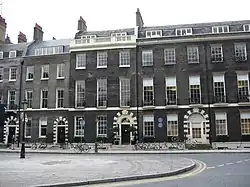 Wohnhäuser aus dieser Zeit in London zeichnen sich durch ihren abgesenkten Keller auf gemauerten Bogenfundamenten, das rustizierte Sockelgeschoss, die höhere Empfangsetage im Piano-Nobile-Stil und das Dachgeschoss aus. Sie werden im Allgemeinen aus polierten (blassgelben) London Stock-Ziegeln in den Proportionen des Goldenen Schnitts gebaut und erstrecken sich häufig über dreifache Erkerfronten mit „angedeuteten“ Säulen oder Pilastern und sorgfältig proportionierten und sehr großen cremefarbenen Schiebefenstern sowie Mansardendächern aus Schiefer über einem Dachgiebel. Sie gruppierten sich um formelle grüne Flächen, als gerade oder halbmondförmige Häuserreihen mit breiten, auf Backsteingewölben gestützten Gehwegen an breiten, geraden öffentlichen Straßen, oft mit privatem Zugang zu romantisch angelegten Gärten. Spätere Eingriffe in Gewerbeimmobilien haben die Breite historischer Straßen in vielen Teilen Londons erheblich verringert, wobei die ursprünglichen Pläne mit denen der kontinentalen Stadtplanung vergleichbar waren.[38] In Spitalfields im Osten Londons gibt es viele erhaltene frühgeorgianische Grundstücke mit einigen ungewöhnlichen kontinentalen Merkmalen;[39] Soho – insbesondere Meard Street[40] und Westminster – bewahren viele Gebäude im frühen georgianischen Stil.
