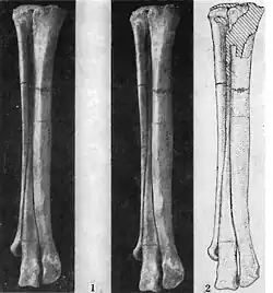 Linker Metatarsus von Tochisaurus, einem Vertreter der Troodontidae. Auch in dieser Gruppe ist der Mittelfuß sehr schlank und lang. Auffällig auch die teilweise Reduktion des Metatarsale II.