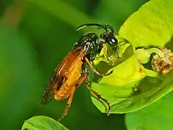 - Arge melanochroa – Die hinteren Femora der Pflanzenwespen sind schwarz; die Vorderflügel besitzen auf Höhe des Flügelmals einen schwarzen Fleck; der apikale Teil der Flügel ist transparent.[2]
