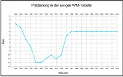 | 88 WM-Spiele 47 Siege 17[1] Unentschieden 24 Niederlagen 152:101 Tore | |