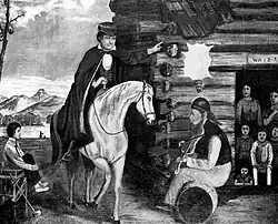 Die Familie des Siedlers ist gleichfalls typisch für den frühen Südwesten. Die Familien waren meist kinderreich, und alle trugen einfache Kleidung aus Beiderwand. Zum Haushalt gehörte fast immer eine größere Anzahl von Hunden. Die aus einem Maiskolben geschnitzte Pfeife der Frau war bis zum Sezessionskrieg ein von beiden Geschlechtern häufig genutzter Gegenstand und die Fiddle fast unentbehrlich, wenn man auf ihr spielen konnte. Auch der Verkauf von selbst gebranntem Whisky war Alltag. Der Wert des reichlich vorhandenen Getreides konnte durch das Schnapsbrennen auf das Zehn- bis Zwanzigfache gesteigert werden. Die Kleidung und Ausstattung des Reisenden und der Besitz eines Reitpferdes weisen ihn als ein Mitglied der Oberschicht aus. Dass jemand wie er bei einem armen Siedler um ein Bett für die Nacht, eine Mahlzeit und Futter für sein Pferd bittet war nicht ungewöhnlich, sondern ein Element der Lebenswirklichkeit in den Pioniertagen. Die Abstände zwischen den Forts und den Städten waren groß, oft mehr als ein Tagesritt. Ein Reisender konnte davon ausgehen, dass er als zahlender Gast willkommen war, und es hatten sich mit der Zeit übliche Preise für eine Übernachtung mit oder ohne Mahlzeiten und für das Futter eines Pferdes herausgebildet.[23]