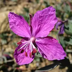 Die zwittrigen Blüten sind bei einer Höhe von 3 bis 5 Zentimeter leicht zygomorph und vierzählig mit doppelter Blütenhülle. Die vier freien Kelchblätter weisen eine Länge von 1 bis 1,6 cm und eine Breite von 1,5 bis 3,5 mm auf. Die vier freien Kronblätter weisen eine Länge von 1 bis 2,4 (selten bis zu 3,2) cm und eine Breite von 0,7 bis 1,5 (selten bis zu 2,3) cm auf. Die Farben der Kronblätter können stark variieren: zum einen kommen kräftig dunkelblütige, purpurrote, rosa-purpurfarbene oder rosafarbene Formen vor, zum anderen kann man auch fast weißblütige Exemplare finden. Die streng protandrischen Blüten produzieren Nektar durch einen erhabenen Diskus an der Basis der Staubblätter und Griffel. Es sind zwei Kreise mit je vier Staubblättern vorhanden. Vier Fruchtblätter sind zu einem unterständigen, vierkammerigen Fruchtknoten verwachsen, der purpurfarben-grün und 1 bis 2 cm lang sowie fein weiß behaart ist. Der kahle, 3,5 bis 8 mm lange Griffel ist anfangs nach unten gebogen, später aufrecht und endet in einer tief vierlappigen Narbe.[1]