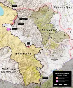 Die Übergabe von Gebieten an Aserbaidschan führte in Arzach zu Problemen in der Kommunikation einschließlich Mobilfunk sowie in der Stromversorgung.[2][3][4] Bereits im Dezember kam es zu Verletzungen des Waffenstillstands durch Aserbaidschan.[5][6] Es folgten weitere Angriffe und Grenzüberschreitungen und -streitigkeiten in der Region zwischen dem Latschin-Korridor und Stepanakert, die einzige Verbindung zwischen Armenien und Arzach.[7] Außerdem Streitigkeiten und Blockaden an der Mine von Sotk, die genau auf der Staatsgrenze liegt[8] und an Orten entlang der Straße zwischen den armenischen Städten Goris und Kapan, die entlang der Grenze verläuft.[9][10][11][12][13][14] Diese unmittelbaren Grenzgebiete hatte Aserbaidschan nicht einnehmen können, sie wurden von Armenien im Laufe des Dezembers 2020 auf Anweisung von Premier Paschinjan geräumt, um Kämpfe mit einrückenden aserbaidschanischen Grenztruppen zu vermeiden.[15]