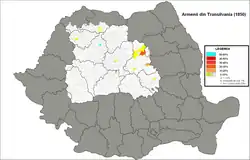 Seit dem hohen Mittelalter fanden Armenier ihren Weg nach Siebenbürgen, wo im 14. Jahrhundert sogar ein armenischer Bischof residierte. Im 15. und 16. Jahrhundert flohen Armenier vor allem aus der Moldau über die Karpaten. 1680 gewährte ihnen der religiös tolerante, evangelische Fürst von Siebenbürgen gewisse Privilegien und Handelskonzessionen und 1696 nach der Vertreibung der Osmanen gewährten die neuen habsburgischen Herren Sonderrechte. Die Armenier durften eigene Gerichte unterhalten, vor allem in ihren Hauptsiedlungen Gherla (nordöstlich von Klausenburg/Cluj, im 17.–19. Jahrhundert auch „Armenopol“ oder „Armenierstadt“ genannt), Elizabethspol (Dumbrăveni, nordöstlich von Hermannstadt/Sibiu), sowie in Gheorgheni (im Nordosten Siebenbürgens). Eine Karte, vermutlich der ersten Hälfte des 19. Jahrhunderts gibt noch mehrere Orte in der Siebenbürgen als hauptsächlich armenisch bevölkert an.[7] Ihre Gesamtzahl betrug wohl 20 000.