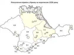 Kleine Minderheiten blieben auch danach auf der Krim. In den Volkszählungen auf der Krim im 19. und der ersten Hälfte des 20. Jahrhunderts schwankte der armenische Bevölkerungsanteil bei durchschnittlich etwa 1–3 %[1]. Erst die Stalinistischen Deportationen nach Nationalität[2] bedeuteten das Ende der armenischen Präsenz auf der Krim, wie überhaupt der gesamten Altbevölkerung aus der Zeit des Krimkhanats (die Mehrheit der Krimjuden waren der Schoah zum Opfer gefallen). Kurz nach der Deportation aller Krimtataren durch den NKWD ab 11./18. Mai 1944 wurden ab 29. Mai/2. Juni auch die armenischen und griechischen Minderheiten von der Krim deportiert (aufgrund ihrer krimtatarischen Umgangssprache und ihrer traditionell engen Kontakte zu den Krimtataren), sowie die im 19. Jahrhundert angesiedelten Bulgaren und Italiener auf der Krim (als Abgehörige von Ethnien, die gleichzeitig in Feindstaaten des Weltkrieges das Staatsvolk stellten).[3] Weil die Deportierten von der Krim in sowjetischer Zeit nie voll rehabilitiert wurden, kehrte die Mehrheit der Krimtataren, einige Griechen, Armenier, Bulgaren und auch einige Krimdeutsche, die im August 1941 deportiert wurden, erst nach dem Ende der Sowjetunion auf die Krim zurück. Wegen des Widerstands der in ihre Wohnungen und Häuser zugeteilten Bewohner, leben die meisten heute gemeinsam in neu errichteten Siedlungen.[4]