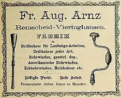 Die beiden Söhne des Gründers, Ernst (1855–1933) und August (1864–1931), traten ebenfalls in die Firma ein.[6] 1879 vergrößerte Friedrich Carl August Arnz den Betrieb und verbesserte die Fabrikeinrichtungen. Fleiß und Sparsamkeit ermöglichten die stetige Weiterentwicklung. Im Fabrikationsprogramm standen jetzt auch Bohrwinden. Jedes Jahr brachte als Folge der Werkzeugmaschinen-Entwicklung Verbesserung in der Herstellung und neue Artikel.