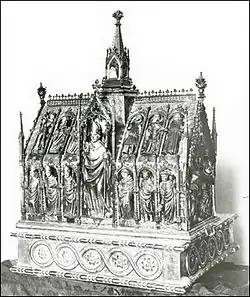 Der Schrein aus Zypressenholz hat die Form einer gotischen Kirche mit einer rechteckigen Grundfläche von 65 × 32,5 cm mit einem Satteldach. Die gesamte Oberfläche ist mit getriebenem Silber überzogen und vergoldet. Der Schrein stellt 28 farbige Relieffiguren dar. Mit 71 cm ist das mittige Kreuz der höchste Punkt des Schreins.