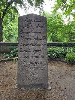 Im Park Planten un Blomen gegenüber der Messehalle 4 B steht ein Gedenkstein in Form eines Sarkophages für die 1138 zunächst in Ottensen bestatteten Vertriebenen. Der Stein nach einem Entwurf von Carl Ludwig Wimmel war 1815 von der Patriotischen Gesellschaft an ihrem Massengrab auf der Wiese an der heutigen Einmündung der Erdmannstraße in die Große Brunnenstraße aufgestellt worden. 1841 wurde er mit den Gebeinen auf den Kirchhof der Hauptkirche St. Nikolai vor dem Dammthor überführt, der später geschlossen und ein Teil des Parks Planten un Blomen wurde.