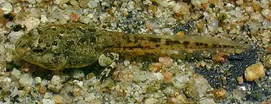 Bei einer Wassertemperatur von 12 bis 16 °C schlüpfen die Larven ab Anfang Juni 4 bis 6 Tage nach der Eiablage, bis zur Auflösung der Eihülle bleiben sie mit ihr noch 5 bis 6 weitere Tage verbunden. Nach dem Schlupf bleiben die Kaulquappen noch etwa 15 bis 18 Tage zusammen.[6] Die gesamte Körperlänge beträgt 17 bis 34 mm, und die äußere Unterlippe ist um ein Drittel bis die Hälfte länger als die innere. Ihre Grundfärbung ist dunkel und darüber matt goldfarben pigmentiert, dorsal umfangreicher punktiert. Ebenfalls sind die Augen matt goldgefärbt. Ventral sind sie weiß bis guanofarben und schillern in einem pinken Farbton. Auf der Unterseite der Schwanzmuskulatur sind auch deutliche guanofarbene Flecken erkennbar. Die Schwanzmembranen erscheinen lichtdurchlässig.[4] Die Larven erreichen eine maximale Schwanzlänge von durchschnittlich 34 mm. Bisher wurde keinerlei Larvalpolymorphismus festgestellt. Die Kaulquappen genießen keinerlei Schutz im Wasser, leben aber versteckt und sind als sehr gute Schwimmer durchaus in der Lage, bei Störung in tiefem Wasser mit einem Zug etwa 2 bis 4 m zurückzulegen. Ansonsten gelten sie als standorttreu und bewegen sich mit einem Zug maximal 5 cm weit fort. Die Larven besiedeln seichte, offene Fließgewässer von Schluff bis grobsteinigen Sedimenten, bevorzugen aber Sand und Kies sowie Standorte unter Baumdächern, jegliche Wasservegetation wird gemieden. Sie ernähren sich von Substraten, zersetzen Detritus und nehmen Mikroorganismen von unterhalb der Oberfläche feiner Sedimente oder zwischen Kies auf. Makroskopische Algen oder Wasservegetation werden verschmäht.[6]