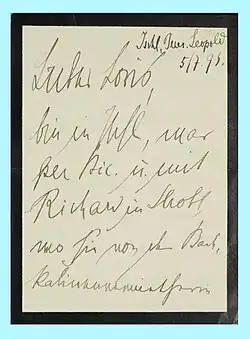 | „Dr. Arthur Schnitzler / Wien XVIII. Sternwartestrasse 71“ | 10. September 1910[23] | August 1918[24] | Auf Briefpapier, Briefkarte gedruckt | ![]() |