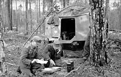 Unmittelbar nach der Erkundung begann daher der Fernsprechtrupp mit dem Aufbau der überlebenswichtigen Feldkabelverbindung zwischen B-Stelle und Batterie, zum Gefechtsstand der Infanterie und dem Abteilungsgefechtsstand der Artillerie.