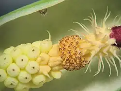 Am Kolben sitzen unten die weiblichen Blüten und darüber die fertilen männlichen (in der Mitte), über den fertilen männlichen Blüten sitzt ein Kranz steriler, borstenartiger Blüten, die auch als Reusenhaare bezeichnet werden. Die reduzierten, eingeschlechtigen Blüten besitzen keine Blütenhüllblätter. Die Staubbeutel sind meist gelb.