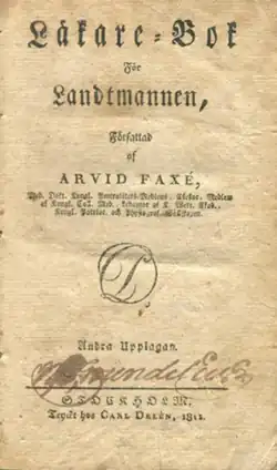 - 1782 Arvid Faxe: Afhandling, om hushålningen til siös, i afseende på hälsans bevarande. Til kongl. örlogs-flottans tienst. Författad af Arvid Faxe. … Med kongelig majestets nådigste privilegio. Carlscrona, tryckt i kongelig amiralitets boktryckeriet. År 1782.(Abhandlung über die Haushaltsführung auf See im Hinblick auf die Erhaltung der Gesundheit. Zum König. Marinedienst. Geschrieben von Arvid Faxe. … Mit dem gnädigsten Privileg Seiner Königlichen Majestät. Carlscrona, gedruckt in der Königlichen Admiralitätsdruckerei. Im Jahr 1782.). Königliche Admiralitätsdruckerei, Carlskrona 1782, S. Digitalisat (alvin-portal.org).
