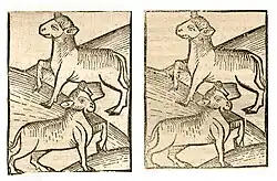 | 091r[16] | Galle des Rindes (rinds gallen) | A Fell und Flecken der Augen - B Panaritium am Finger (ungenannter Wurm). ----- A = Heidelberg. Cpg 226. Elsass 1459-1469, Blatt 104v[17] | Bos primigenius taurus | ![]() |