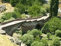 Die älteste und im Mittelalter einzige Brücke der Stadt aus dem Jahr 1664 besteht aus drei unterschiedlich hohen Spitzbögen und liegt an einer scharfen Flussbiegung, wo sie vor hohen Fluten geschützt war. Durch die an dieser Stelle besonders steilen Klippen der Schlucht konnte sie gut verteidigt werden. Die Reste einer urartäischen Festung aus dem 7. Jahrhundert v. Chr. oberhalb erinnern an Vorgängerbauten, die einst an dieser strategisch wichtigen Stelle den Fluss überquerten. Die einzige Kirche südlich des Kassagh ist die kleine Sankt-Sergius-Kirche (Surb Sargis) am Rand der Schlucht oberhalb der Brücke. Auf dem Fundament einer zerstörten älteren Kirche wurde sie 1986 als Nachahmung einer Kreuzkuppelkirche des 13. Jahrhunderts neu erbaut. Unterhalb der urartäischen Festung ist ein Abschnitt eines im 1. Jahrtausend v. Chr. angelegten Kanalbewässerungssystems erhalten, das einen Vorläufer des in der sowjetischen Zeit ausgebauten und seit der Jahrtausendwende erweiterten Arzni-Schamiram-Kanals darstellt, der Wasser aus dem Sewansee über den Hrasdan und zusätzlich aus dem Kassagh ableitet und in den Ebenen der Provinz Aragazotn verteilt.[7] Der Weg in die Schlucht nördlich der mittelalterlichen Brücke führt an einem leer stehenden Badehaus aus dem 18./19. Jahrhundert vorbei, das mit warmem Mineralwasser gespeist wurde.