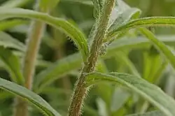 Die unregelmäßig, gewöhnlich wechselständig am Stängel angeordneten Laubblätter besitzen kurze, 1 bis 5 mm lange Stielen oder sind sitzend. Die dünne, feste und gelegentlich wellige Blattspreite ist bei einer Länge von 3 bis 11 cm und einer Breite von 0,3 bis 3,0 cm, ganzrandig, eilanzettlich bis lanzettlich mit zugespitztem oder auch stumpfem Ende. Vor allem die Blattunterseite ist mit dünnen Härchen besetzt.