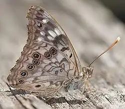 - Asterocampa leilia, hat zwei dunklere Bereiche und zwei schwarze Augenflecke auf dem Vorderflügel.