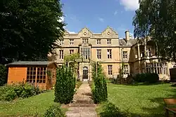 Rechts des Haupthauses befindet sich ein bogenbewehrter, steinerner Garteneingang im Tudorstil, links des Haupthauses ein etwas späterer, gegiebelter Anbau mit Uhr und Ziegelstallungen mit Steinverkleidungen.[2]