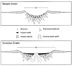 In einfachen Kratern wird die ursprüngliche Aushöhlung durch Brekzie, Ejekta und Gesteinsschmelze überlagert.