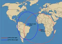 Der Beobachter bestimmt mit dem Sextanten zu einem bestimmten Zeitpunkt die Höhe des Gestirns. Der Greenwich Stundenwinkel und die Deklination des Gestirns werden für diesen Zeitpunkt der Nautischen Tafel[4] entnommen. Für jede mögliche Breite des Beobachters, kann die dazugehörende Länge mit obiger Formel berechnet werden. Das Ergebnis ist eine geschlossene Standlinie auf der Erdoberfläche. Von jedem Punkt dieser Standlinie (in der Grafik blau eingezeichnet), wird das Gestirn zu einem bestimmten Zeitpunkt in gleicher Höhe gesehen.