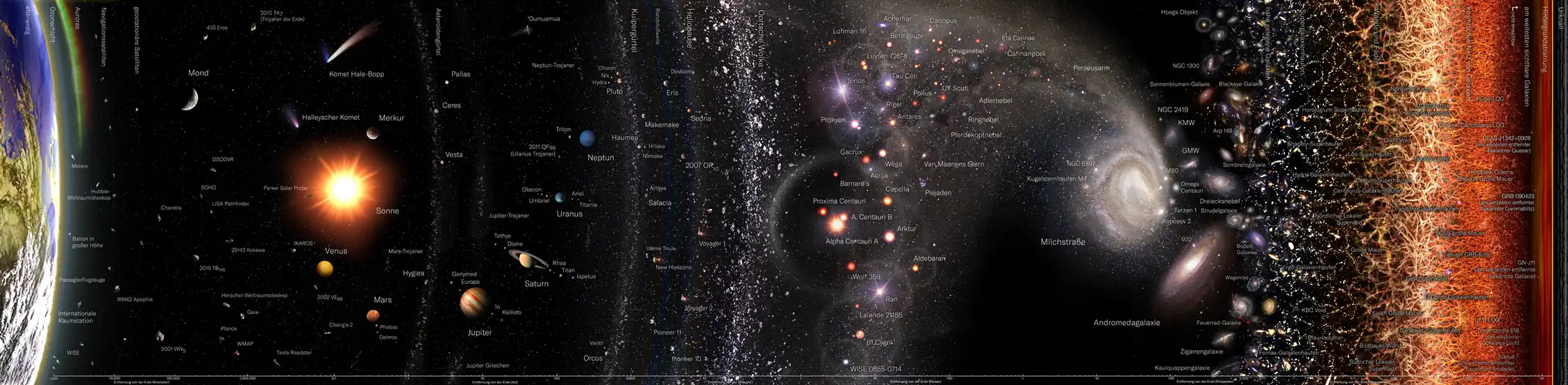 - Randbereiche des Sonnensystems: sonnenferne Objekte bis zur Heliopause, etwa 100.000 AE = 1,5 Lichtjahre