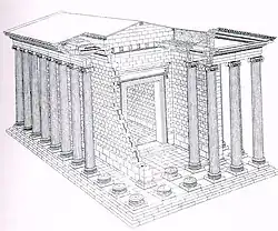 Östlich des Tempels stand ein Altar, dessen Äußeres durch Pilaster ionischer Ordnung und Frauenskulpturen in den Zwischenflächen gegliedert war.[6] Ganz im Osten des Heiligtums öffnete ein nur schlecht erhaltener Torbau, dessen Achse genau auf die Straße zur Stadt ausgerichtet war und der die Breite der Straße aufnahm, den Zugang zum Heiligtum.