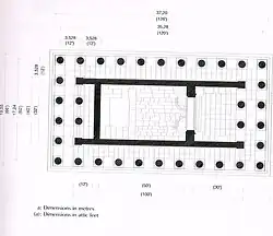 Der Tempel erhob sich innerhalb des rechteckigen Athenaheiligtums der Stadt. Er stand auf dem gewachsenen Felsen, nur an der Südseite gibt es mächtige Fundamente, die die Unebenheiten des Geländes ausglichen. Der aus lokalem Stein errichtete Tempel war ein ionischer Peripteros von 6 × 11 Säulen und mit hoher Genauigkeit Ost–West orientiert.[4] Der Bau maß 19,53 × 37,17 m. Die Cella war 100 Fuß lang. Die Höhe der Säulen ist nur zu rekonstruieren und betrug zwischen 11,62 m und 12,93 m. Der Tempel bestand aus Pronaos, Cella und Opisthodom. Seine Säulen standen auf ionischen Basen. Die bis ins 18. Jahrhundert noch weitgehend erhaltenen Wände des Tempels sind heute bis auf wenige Reste zerstört. Das Gebälk wies einen Zahnschnitt zwischen zwei Reihen von Eierstäben auf, denen eine Reihe von Löwenkopf-Wasserspeiern als oberer Abschluss folgte. Wahrscheinlich waren im Innern des Tempels Reliefs mit der Darstellung einer Gigantomachie und von Amazonen angebracht.[5]