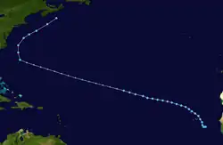 Isaac hat seinen Ursprung in einer Störung an der Westküste Afrikas, aus der sich das System am 23. September löste. Das System überquerte den Atlantik entlang der innertropischen Konvergenzzone und die Konvektion entwickelte sich kontinuierlich besser.[43] Am 29. September wurde das System als Tropisches Tiefdruckgebiet Sechzehn klassifiziert, etwa 1450 km südöstlich von Barbados. Die Zugbahn schwenkte zwei Grad weiter nach Norden, möglicherweise durch die Bildung eines neuen Zentrums. Am 30. September wurde das System zum tropischen Sturm hochgestuft.[2]