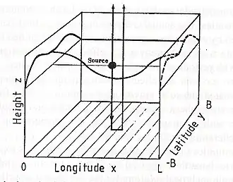 Durch die Linearisierung ist eine Separation der Variablen in die Horizontalstrukturen geographische Breite und Länge (φ, λ) sowie Höhe z möglich. Die nach oben laufende Welle der der Gl. 1 äquivalenten Lösung ist dann[5][6]