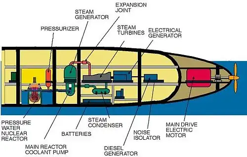 Ein Unterseeboot mit Atomantrieb besitzt einen Kernreaktor, wie er an Land etwa in Kernkraftwerken eingesetzt wird, allerdings weit kleiner, da er in eine Hülle mit einem Durchmesser von unter zehn Metern passen muss. Der Reaktor erhitzt dabei eine Flüssigkeit im radioaktiven Primärkreislauf. Diese wiederum gibt ihre Wärme in einem Wärmeübertrager an hochreines Wasser im nicht radioaktiven Sekundärkreislauf ab. Der entstehende, unter hohem Druck stehende Dampf treibt eine Turbine an. Ein an diese Turbine angeschlossener Generator wandelt die mechanische in elektrische Energie für die Bordsysteme und lädt Batterien auf, die auch bei einem Reaktorausfall Energie liefern. Beim turbo-elektrischen Antrieb wird die Propellerwelle von einem Elektromotor angetrieben. Häufiger wird jedoch eine Getriebeturbine eingesetzt, die die Welle direkt mit der Energie der Turbine antreibt.
