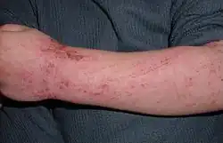Die Haut des Betroffenen unterscheidet sich von gesunder Haut durch eine gestörte Barrierefunktion. Daher äußert sich das atopische Ekzem insbesondere durch eine sehr empfindliche und trockene Haut, die oft auch gerötet ist. Sie ist besonders anfällig für äußere Reize, die zu Juckreiz führen können.[9] Typische Stellen (Prädilektionsstellen) für die betroffene Haut sind insbesondere die Armbeugen, die Kniekehlen sowie die Hals- und Gesichtspartie.