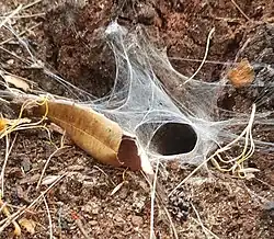 Das Männchen erweitert den Röhreneingang vom Unterschlupf des Weibchens, wenn es sich in dessen Trichter begibt. Dann streckt es seine Beine aus, was zu einer ausladenden Bewegung des Körpers führt, die dann die Seidenwände des Baus um etwa ein Viertel auf die Körpergröße des Männchens anhebt. Bei dieser Bewegung des Männchens, die einem Liegestütz ähnelt, wird manchmal simultan zum Ausheben vom Männchen Spinnseide produziert.[19]