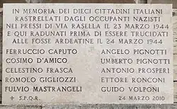 Das Attentat und das Massaker in den Ardeatinischen Höhlen wurden 1962 im Film Zehn Italiener für einen Deutschen von Filippo Walter Ratti thematisiert. Im Jahre 2010 wurde an der Mauer des nahegelegenen Palazzo Barberini eine Gedenktafel angebracht, zur Erinnerung an zehn damalige Anwohner der Via Rasella, die als Vergeltung für das Attentat in den Ardeatinischen Höhlen umgebracht wurden.[3]