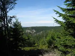 Blick vom Turm der Hanskühnenburg über die Waldlandschaft von Auf dem Acker vorbei an der Hanskühnenburgklippe in Richtung Nordosten; am Horizont sind der Fernmeldeturm an der Stieglitzecke (links) und der Brocken (rechts) zu erkennen