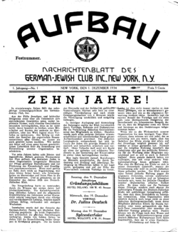 Am 1. Dezember 1934 erschien der Aufbau erstmals als zunächst kostenloses Vereinsblatt des „German Jewish Club“ in New York. Ab der Ausgabe vom 5. September 1941 erschien im „Aufbau“ vierzehntäglich die Beilage „Die Westküste“ für die Leser in Kalifornien, Oregon und Washington.[5] 1941 gab der „Jewish Club of 1933“ seine bisherige Clubzeitung „Neue Welt“ auf und gab stattdessen mit der Ausgabe des „Aufbau“ vom 17. Oktober 1941 die vierzehntägliche Kolumne „Jewish Club of 1933“ heraus.[6]