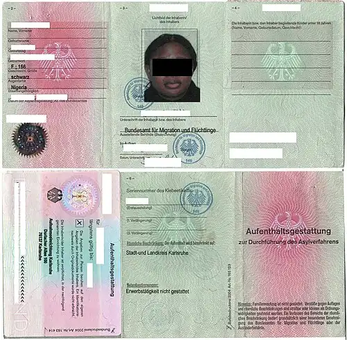 Die Aufenthaltsgestattung wird in Papierform als dreiteiliges Blatt erteilt, auf dem auf der fünften Seite ein Klebeetikett mit der aktuellen Gültigkeit aufgetragen wird. Aufenthaltsgestattungen als elektronischer Aufenthaltstitel sind nicht vorgesehen.