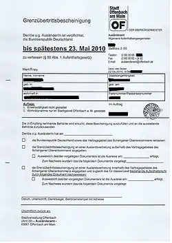 Ebenso faktisch geduldet sind Personen mit einer Grenzübertrittsbescheinigung. Sie sind ausreisepflichtig und können freiwillig ausreisen. In der Regel wird eine Grenzübertrittsbescheinigung nur für sehr kurze Zeiträume ausgestellt und zwar in Fällen, in denen eine freiwillige Ausreise beabsichtigt ist und unmittelbar bevorsteht. Rechtlich gesehen liegt aber auch in diesen Fällen bis zum Ablauf der oft auf der Grenzübertrittsbescheinigung vermerkten Ausreisefrist eine Duldung vor, da es den Ausländerbehörden rechtlich verwehrt ist, den Aufenthalt eines ausreisepflichtigen Ausländers ohne Duldung zu tolerieren.[10]