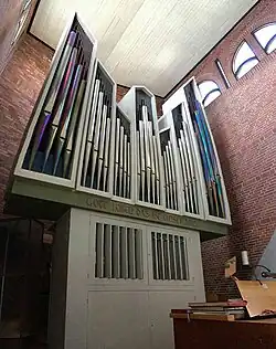 Die Orgel baute Gerhard Schmid aus Kaufbeuren im Jahr 1967 ein. Der Umriss der Orgel erinnert an die Engel auf dem Leuchter. Die zum Lob Gottes erhobenen Arme finden sich auch in der Gestaltung der Orgel wieder.[3]