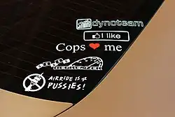 Aufkleber dürfen grundsätzlich nur auf eigenem Besitz angebracht werden. Aufkleber in der Öffentlichkeit können je nach Stadt und Art des Stickers als Sachbeschädigung oder Ordnungswidrigkeit ausgelegt werden. Oftmals kann jedoch der Verursacher nicht oder nur mit sehr hohem Aufwand herausgefunden werden, wodurch eine Art Duldung entsteht. Tabu sind Aufkleber, die die Verkehrssicherheit gefährden wie z. B. auf Ampelanlagen.[12]