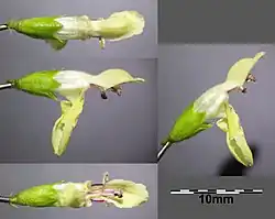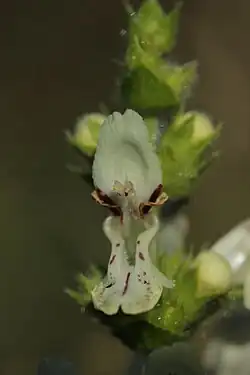 Die zwittrige[1][6] Blüte ist zygomorph und fünfzählig mit doppelter Blütenhülle. Der 5 bis 10 Millimeter lange röhrig-glockige Kelch ist rauhaarig mit kahl-stachelspitzigen, vorgestreckten Zähnen und mit kahlen, stechenden Grannenspitzen. Die Krone ist blass-gelb bis gelblich-weiß. Die Kronröhre besitzt innen einen Haarring.[7] Die ganzrandige Oberlippe ist aufgerichtet und hat zurückgechlagene Ränder.[7] Die dreilappige Unterlippe ist herabgeschlagen, mehr oder weniger braun gezeichnet und rückwärts gefaltet.[7] Die vier Staubblätter krümmen sich stark auswärts mit spreizenden Pollensäcken.[7]