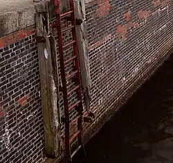 - Das Fehlen einer kapillarbrechenden Schicht in der Mauer, unter der Mauer oder dem Boden. Kapillarbrechende Wirkung haben beispielsweise Schotter aus dichtem Gestein oder WU-Beton. Beide sind seit langer Zeit gängige Materialien für das Fundament eines Hauses. Auch die Übergänge zwischen Fugenmörtel und Ziegelstein in Ziegelmauerwerk wirken hemmend auf den kapillaren Aufstieg, weshalb Bodenfeuchte in Ziegelmauern in der Regel meist nicht höher als 7 bis 10 Ziegelschichten[1] und teilweise nur weniger als 20 cm aufsteigt.[2]