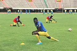 Das allgemeine Aufwärmen soll den Körper insgesamt leistungsfähig machen. Das geschieht durch Übungen, die der Erwärmung der großen Muskelgruppen dienen, zum Beispiel Einlaufen oder Radfahren. Beim Warmlaufen genügen etwa fünf Minuten in zügigem Lauftempo, um das Herz-Kreislauf-System in Schwung zu bringen. Dem folgt üblicherweise eine etwa zehnminütige Kombination aus Dehn- und Kräftigungsübungen (Funktionsgymnastik, Stretching).[2] Zu ausgiebiges Dehnen sollte vermieden werden, da dadurch der Muskeltonus sinkt, was schnelle Kraftentwicklung und Bewegungen erschwert.[3]