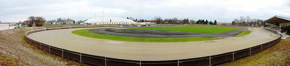 1969 fertiggestelltes Stadion; überdachte Haupttribüne mit 1136 Sitzplätzen, ansonsten Erdwälle. 400-Meter-Kampfbahn (Leichtathletik) und 500-Meter-Sandbahn für Sandbahnrennen (Motorräder und Seitenwagenmotorräder). Zusätzlich 5 große und 2 kleine Nebenfelder, 1 Sandplatz, 1 Turnhalle.