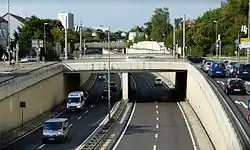 An der Stelle, an der die B 17 die alte Hauptstraße von Kriegshaber, die Ulmer Straße, kreuzt, gibt es keine Auf- oder Abfahrt. Hier ist die B 17 unter das Bodenniveau verlegt und gedeckelt. Südlich davon befindet sich auf dem ehemaligen Gelände des TSV Kriegshaber der Osterfeldpark, der von der B 17 in eine westliche und eine östliche Hälfte getrennt wird. Eine Fußgängerbrücke verbindet beide Teile des Parks.