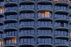 Der Hotelturm wurde in der für die 1970er-Jahre typischen Sichtbeton-Bauweise errichtet. Das formale Vorbild lieferten die 179 Meter hohen Marina-City-Towers in Chicago, die Bertrand Goldberg 1959–64 errichtet hatte.[14][15]
