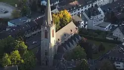 St. Nikolaus | dreischiffige Säulenbasilika mit Querschiff aus Backsteinmauerwerk mit zwei Flankiertürmen im Chorbereich; vorgesetzter markanter fünfgeschossiger Westturm mit Säulengalerie im dritten Turmgeschoss; Fertigstellung der Kirche nach Langes Tod durch Richard Odenthal[1]:273 ff., Restaurierungen 1955 und 1978–1979, Ersatz der Kirchenfenster nach dem Zweiten Weltkrieg[1]:294 ff. | ||