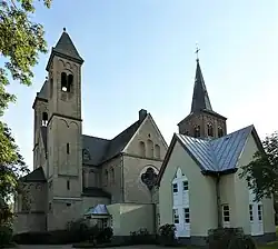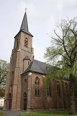 St. Antonius Eremit | Neubau | einschiffige Backsteinkirche mit Tür- und Fensterstöcken aus Werkstein; quadratischer dreigeschossiger Glockenturm mit achteckigem Turmhelm und einem Treppenturm im Westen; Altarmensa aus Savonnière-Kalkstein.[1]:253 ff. | |