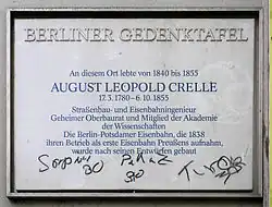Zur Erinnerung an den Mathematiker und Baumeister trägt seit 1958 die Crellestraße im Berliner Ortsteil Schöneberg – nahe der von ihm entworfenen Bahnlinie – seinen Namen.[11]