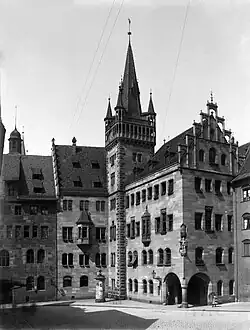 - Neues Rathaus in Nürnberg (Essenwein-Bau) mit Rathausturm (Rathausgasse/Fünferplatz/Theresienstraße), 1885–1889 (1944/45 zerstört, Reste 1951 für veränderten Wiederaufbau und Umgestaltung des Platzes abgebrochen)